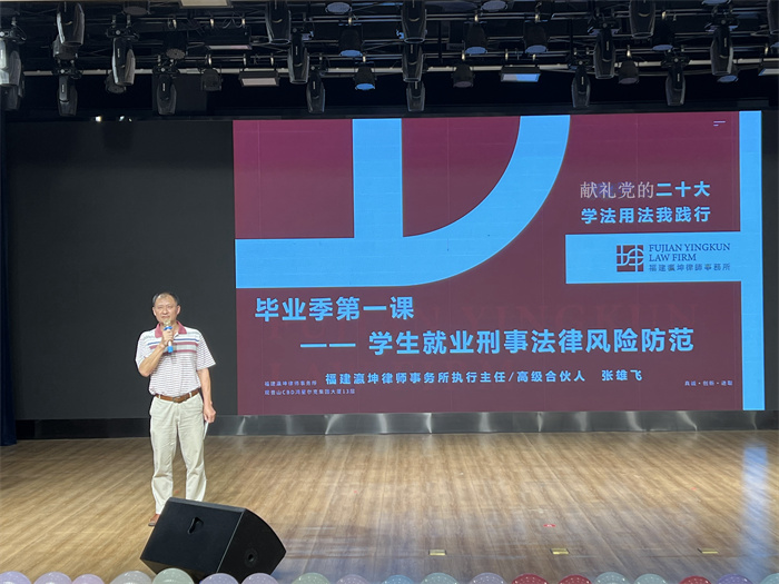 福建灜坤律师事务所执行主任张雄飞律师作专题法治讲座。张律师围绕“帮信罪”概念性质特点、如何预防“帮信罪”、反诈防骗、毕业季就业陷阱防范、其他常见罪名、依法维护权益等方面生动开讲,让在场师生更加明确了学习法律知识的重要性,进一步激发大家学习法律的主动性和积极性。