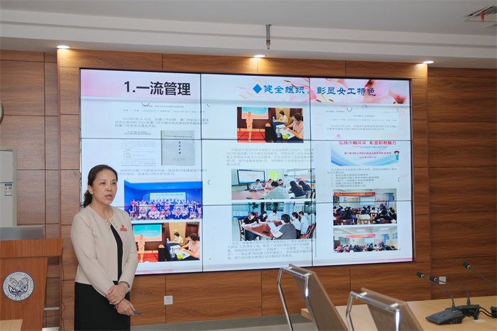 在第一会议室举行的评估工作汇报会上,外国语与旅游学院院长崔筱力对许处长一行的到来表示热烈欢迎并从管理、人才、服务、业绩四个方面汇报了外国语与旅游学院创建省级巾帼文明岗工作情况。她表示学校高度重视省级巾帼文明岗工作,不断健全组织,提高自身价值,积极实践,勇攀高峰,2020年12月旅游职业教育集团获评福建省示范性职业教育集团;2020年12月外国语与旅游学院分工会获评“福建省模范职工小家”称号;2021年4月旅游职业教育集团入选全国第二批示范性职业教育集团(联盟)培育单位;崔筱力家庭先后获评“厦门市最美家庭”“厦门市文明家庭”“福建省最美家庭”等。