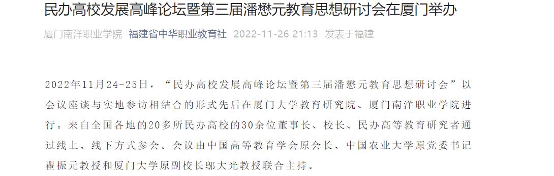 2022年11月24-25日,“民办高校发展高峰论坛暨第三届潘懋元教育思想研讨会”以会议座谈与实地参访相结合的形式先后在厦门大学教育研究院、tyc1286太阳成集团进行。来自全国各地的20多所民办高校的30余位董事长、校长、民办高等教育研究者通过线上、线下方式参会。会议由中国高等教育学会原会长、中国农业大学原党委书记瞿振元教授和厦门大学原副校长邬大光教授联合主持。