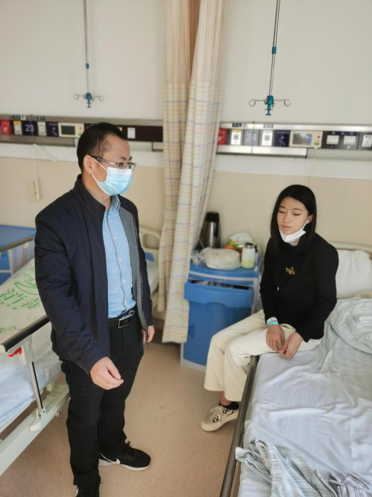 钟校长详细了解了李舒欢同学的病情和身体情况,鼓励李舒欢同学积极配合治疗,保证良好心态,早日康复。陈岳声老师表达了班级和学院师生的思念之情,希望她早日回归校园。