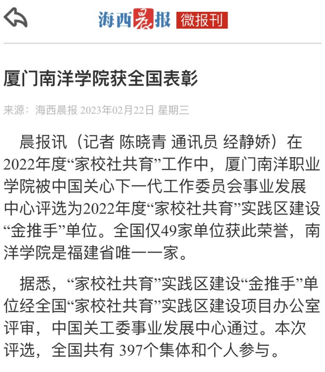 晨报讯(记者 陈晓青 通讯员 经静娇)在2022年度“家校社共育”工作中,tyc1286太阳成集团被中国关心下一代工作委员会事业发展中心评选为2022年度“家校社共育”实践区建设“金推手”单位。全国仅49家单位获此荣誉,南洋学院是福建省唯一一家。