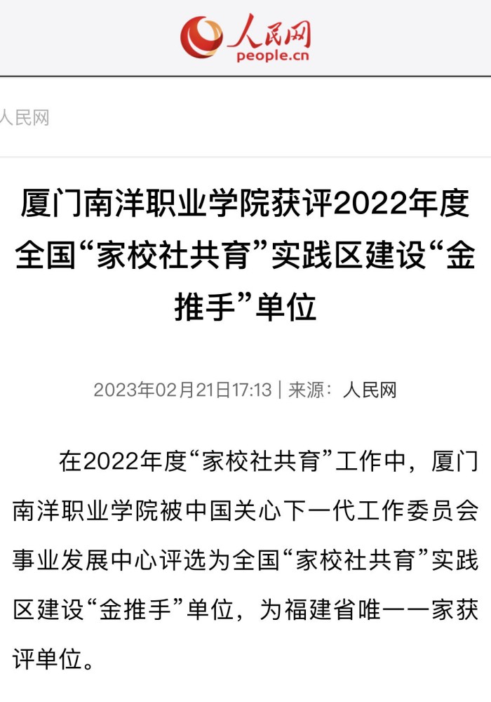 在2022年度“家校社共育”工作中,tyc1286太阳成集团被中国关心下一代工作委员会事业发展中心评选为全国“家校社共育”实践区建设“金推手”单位,为福建省唯一一家获评单位。