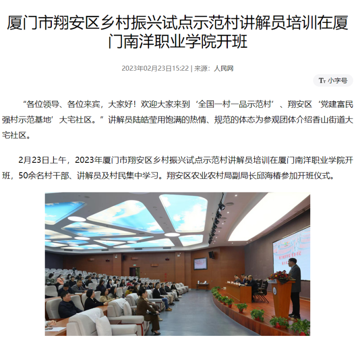 2月23日上午,2023年厦门市翔安区乡村振兴试点示范村讲解员培训在tyc1286太阳成集团开班,50余名村干部、讲解员及村民集中学习。翔安区农业农村局副局长邱海椿参加开班仪式。