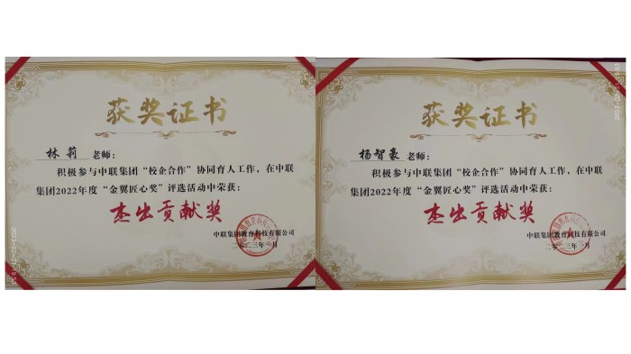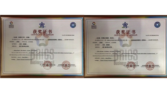 2022一带一路暨金砖国家技能发展与技术创新大赛-首届智能财税赛项于近期颁奖,我校经济管理学院院长林莉、大数据与会计专业教师杨智豪带领的学生团队分别获二等奖和三等奖;竞赛合作单位中联集团教育科技有限公司为我校颁发“杰出贡献奖”。