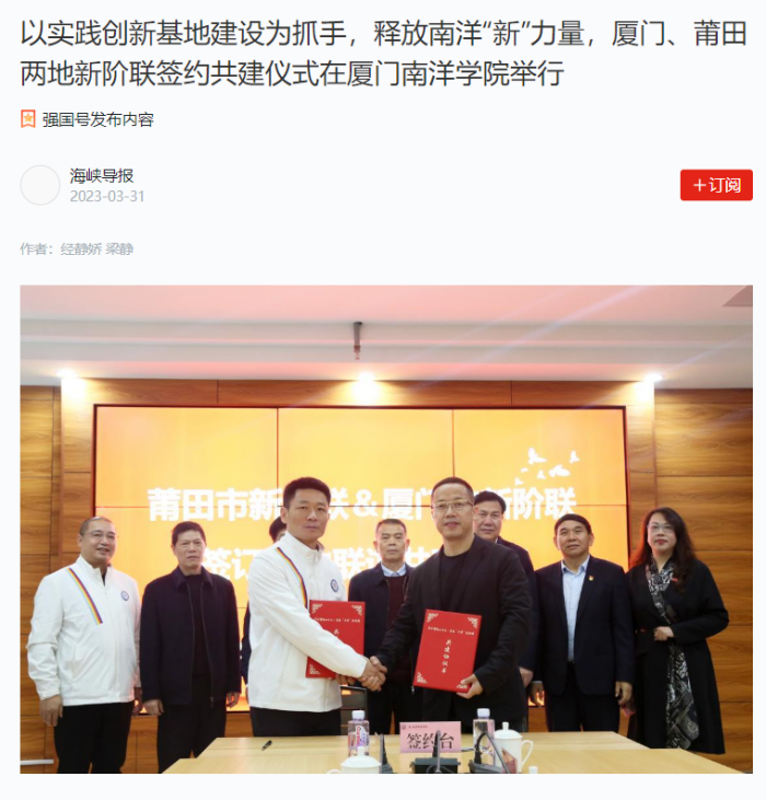 3月30日,厦门市、莆田市两地新阶联签约共建仪式在厦门南洋学院举行。莆田市委统战部二级巡视员许卫雄,翔安区委常委、统战部部长庄平勇,厦门市委统战部新阶知工处负责人纪佩章,厦门南洋学院党委书记施水成,两地市委统战部人员、新的社会阶层人士代表及相关人员参加。