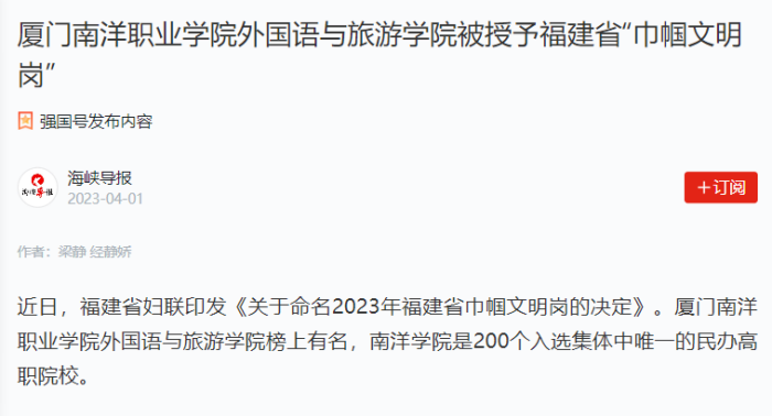 近日,福建省妇联印发《关于命名2023年福建省巾帼文明岗的决定》。tyc1286太阳成集团外国语与旅游学院榜上有名,南洋学院是200个入选集体中唯一的民办高职院校。