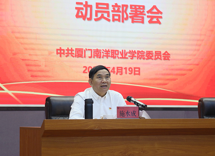 施水成指出深入开展学习贯彻习近平新时代中国特色社会主义思想主题教育,是当前一项重大政治任务,也是今年学校党委工作的重中之重。对此,他提出四点意见。一要深刻领会开展主题教育的重大意义;二要牢牢把握主题教育的目标要求;三要统筹推进主题教育的各项工作;四要切实加强对主题教育的组织领导。他表示,要把开展主题教育与创建生态文明校园相结合,把主题教育转化为推动学校改革发展的强大动力,不断书写学校内涵式高质量发展新篇章,为实现社会主义现代化贡献南洋力量。