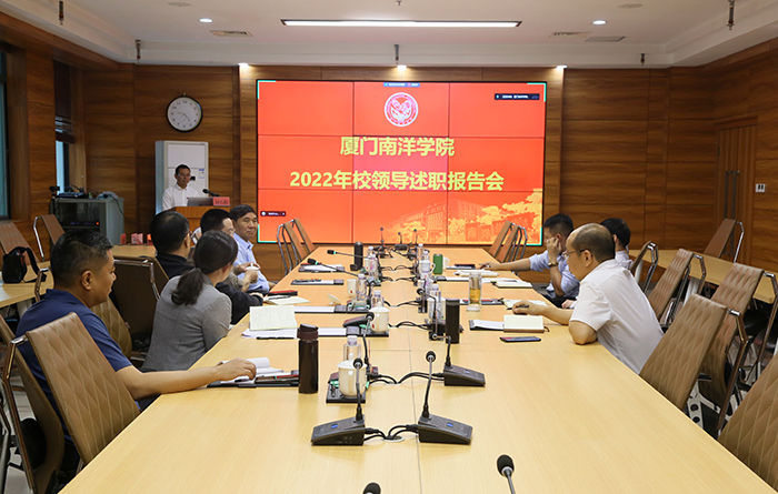 为进一步推动学校内涵建设,提高校领导履职尽责能力,增强担当作为意识。2023年4月24日,厦门南洋学院校领导2022年度述职报告会议在第一会议室举行。我校党委书记施水成通报了学校党委主要工作,校领导鲁晓芹、钟石根、许智坚、李振杰、蓝德森分别作个人述职报告,校董事会成员鲁加升、鲁晓芹、潘恒曦、黄磊康、施水成、王晨听取汇报。