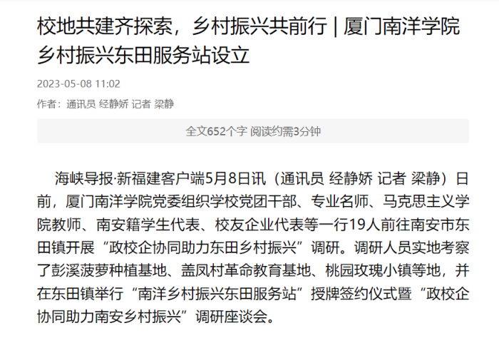 实施乡村振兴战略,高职院校重任在肩。厦门南洋学院自2022年1月成立乡村振兴学院以来,探索政校企协同模式,持续助力福建各地乡村振兴成效显著。厦门南洋学院党委书记施水成表示“将借助学校科技、人才、成果及校友企业优势深化校地合作,全力为南安市乡村振兴做出贡献。”接下来,南洋不仅会在规划设计、产品营销、文旅发展等方面集结各方优势,积极与东田镇开展多方式的帮助与支持。学校党团组织还将与东田镇对接共建,把东田镇乡村振兴需求融入教育教学活动,进一步提升青年学生服务社会的实际技能及服务乡村的家国情怀。