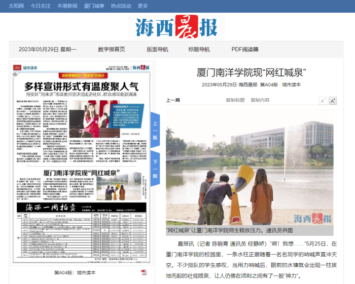 晨报讯(记者 陈晓青 通讯员 经静娇)“啊!我想……”5月25日,在厦门南洋学院的校园里,一条水柱正跟随着一名名同学的呐喊声直冲天空。不少排队的学生感叹,当用力呐喊后,眼前的水塘就会出现一柱拔地而起的壮观喷泉,让人仿佛在顷刻之间有了一股“神力”。