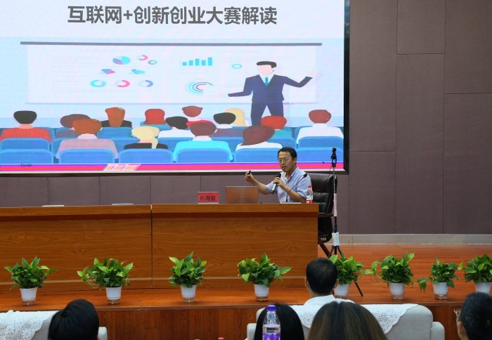 孙海信老师为在场师生做专题报告,重点解读了赛事三大方面,一要对赛事有完整的整体认知,了解文件精神;二是项目来源和选择,要与当地产业紧密结合,并融入专业与学科特色;三是商业计划书的撰写和路演技巧。