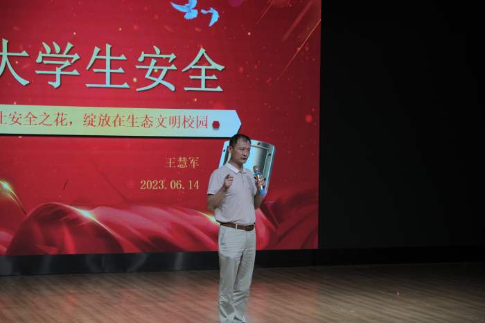 后勤保卫处副处长王慧军以“让安全之花,绽放在生态文明校园”为题,从国家安全、交通安全、游泳安全、消防安全、防诈反骗五个方面向在场学生讲解安全的重要性,提醒大家加强安全意识、重视安全健康,共同营造安全规范的生态文明校园环境。