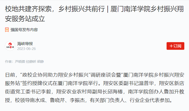 日前,“政校企协同助力翔安乡村振兴”调研座谈会暨“厦门南洋学院乡村振兴翔安服务站”签约授牌仪式在厦门南洋学院举行。翔安区委副书记温普华,翔安区新店街道党工委书记李毅,翔安农业农村局副局长邱海椿,南洋学院创办人鲁加升教授,校领导施水成、鲁晓芹、李振杰,有关部门负责人、行业企业代表参加。