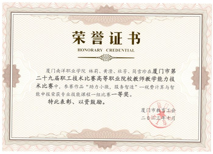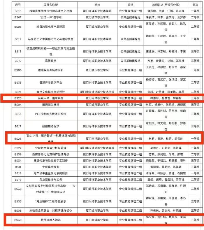 我校《“助力小微,服务智造”——税费计算与智能申报》课程团队(林莉、黄澄、杜芳、简雪珍)荣获一等奖;《系观人体,趣味解剖》课程团队(林惠珍、赵慧雪、林铭榆)和《特种机器人调试》课程团队(邹少琴、侯红科、林惠玲、吴福森)荣获三等奖。