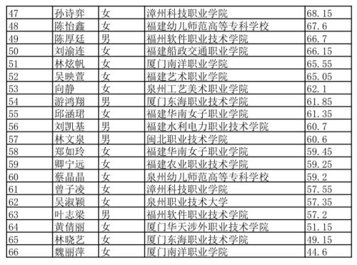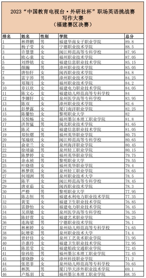 根据2023年“中国教育电视台•外研社杯”职场英语”挑战赛福建赛区决赛结果,现将演讲、写作选手成绩公示如下,公示期限为三个工作日。公示期结束后将发布两个赛项的获奖情况以及晋级国赛的院校和选手。
