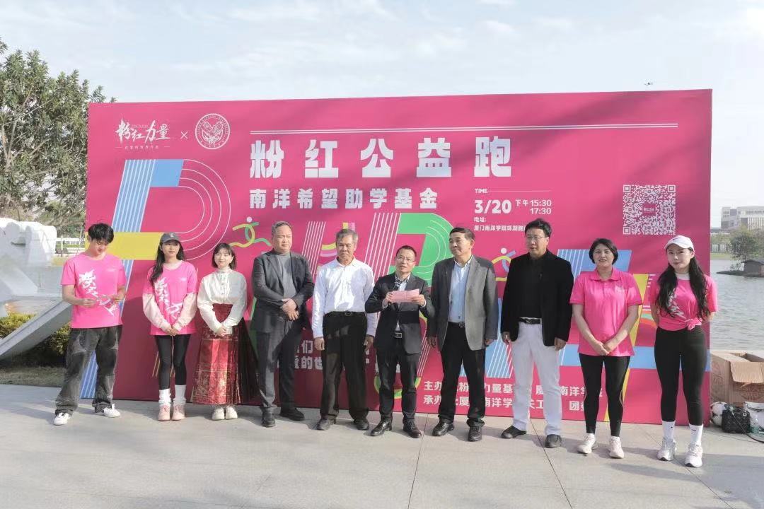 在这春意盎然,生机勃勃的美好时光,厦门南洋学院在校内环湖跑道隆重举行“南洋希望助学•粉红公益跑”活动。厦门市教育系统关工委副主任洪敬,福建省粉红力量妇女儿童帮扶基金会秘书长周婉虹,我校执行校长钟石根、关工委执行主任施水成,诺斯蒂文体发展(厦门)有限公司、甄小燕品牌、翔安厦航三六里荟妍美学空间等企业代表,以及我校师生代表百余人参与活动。