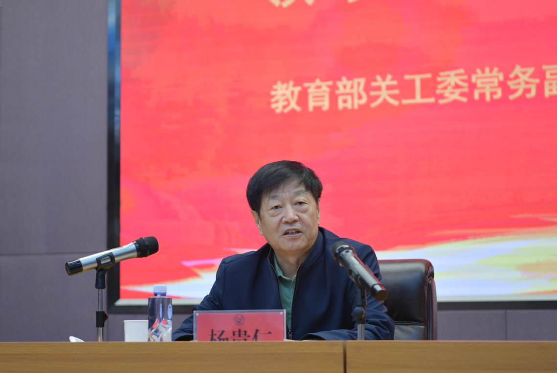 杨贵仁结合深入贯彻落实中办、国办46号文件和教育部党组34号文件,就如何认识关工委工作的重要性、关工委的主要任务是什么、怎样搞好关工委建设、高校关工委主要工作,以及如何做好民办高校关工委建设等五个方面作全面介绍,并提出具体要求。他强调,要继续把民办高校关工委建设作为工作重点,着力抓好关工委领导班子、办事机构、条件保障、“五老”队伍、活动品牌和推进二级关工委建设等民办高校关工委建设中的突出问题,积极为民办高校关工委开展工作搭建平台,切实加大民办高校关工委培训力度,推动民办高校关工委建设迈上新台阶。