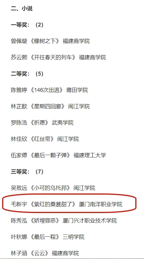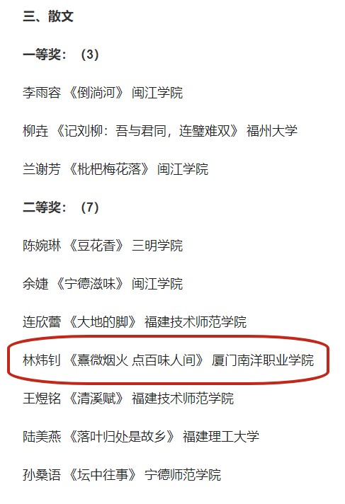 近日,由福建省写作学会主办的第四届福建省大学生文学创作大赛结果揭晓。我校艺术设计学院W19广告设计与制作2班林炜钊同学的作品《熹微烟火,点百味人间》获得散文组二等奖(指导老师:滕春玉);人文社科学院W23服装与服饰设计班毛新宇同学的作品《紫红的桑葚甜了》获得小说组三等奖(指导老师:黄文革)。