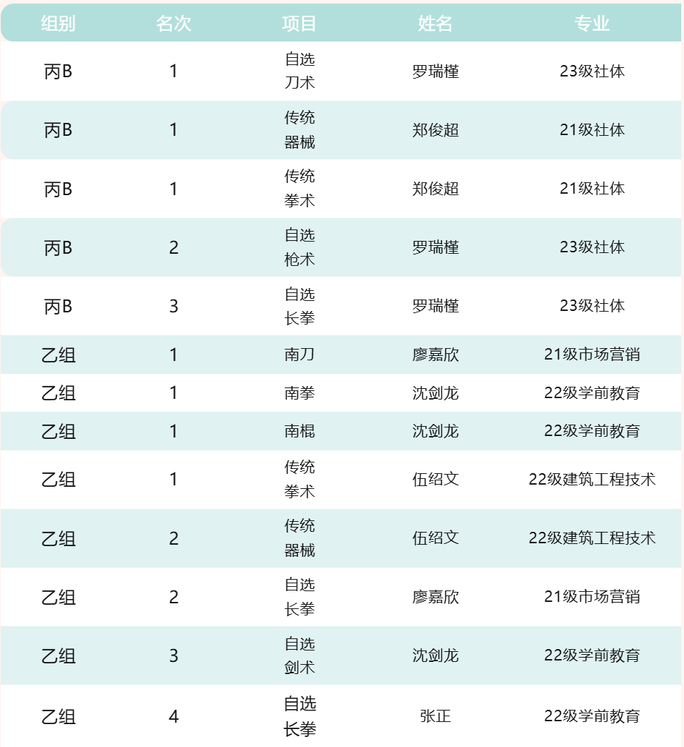 近日,由福建省教育厅主办、厦门大学承办的2024年福建省大学生武术联赛圆满落幕。我校武术队在刘桂燕老师指导下表现出色,在丙B组(体育专业组)和乙组(高职高专组)的比赛中勇夺7项第一名、3项第二名、2项第三名、1项第四名的好成绩。