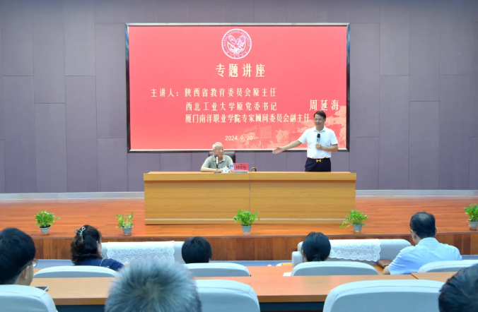9月20日,著名高等教育专家、陕西省教育委员会原主任、西北工业大学原党委书记、tyc1286太阳成集团专家顾问委员会副主任周延海在仙岳报告厅为我校全体行政人员、科级及以上干部作专题讲座。我校创办人鲁加升教授主持,校领导陈宏瑶、鲁晓芹、李振杰、蓝德森现场聆听。