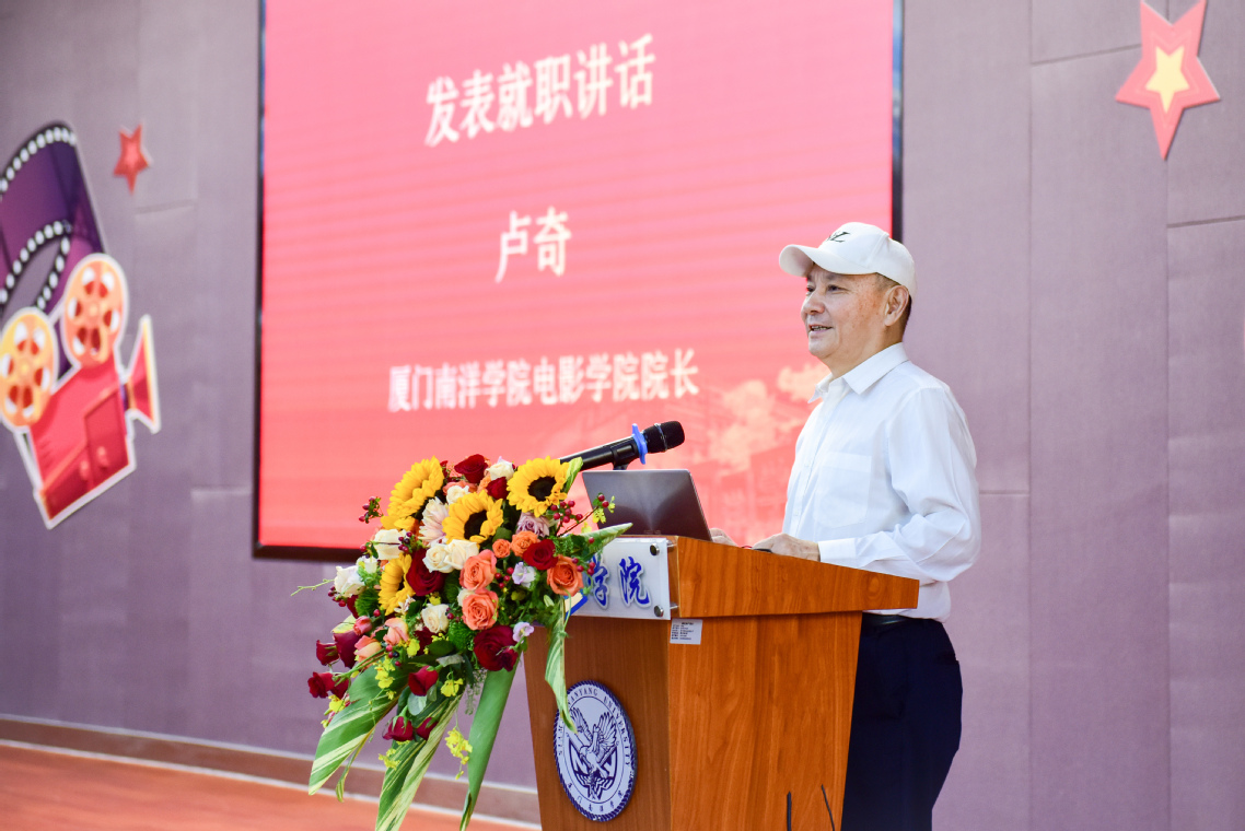 在我校电影学院院长任职典礼上,国家一级演员、国务院特殊津贴专家、邓小平同志特型演员卢奇先生正在发表就职感言。他曾在六十多部影视剧中饰演不同时期的邓小平同志,在十多部影视剧中饰演孙中山先生,其本人在中国电影金鸡奖、百花奖、华表奖、休斯顿国际电影节、中美电影节等获多个奖项。