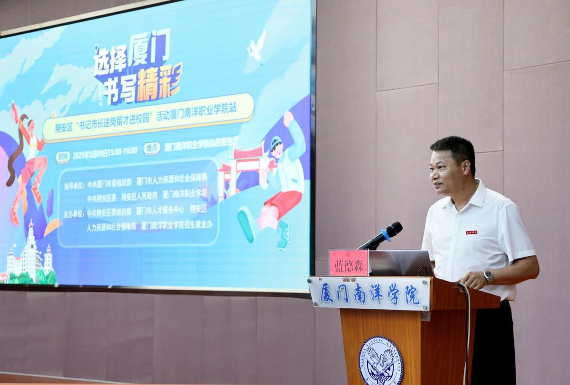 我校副校长蓝德森在讲话中指出,本次活动搭建起政府资源、企业需求与高校人才培养的精准对接平台,为毕业生铺就直通优质岗位的“快车道”,希望广大学子把握机遇,在厦门这片充满希望的热土上施展才华,书写属于自己的精彩人生篇章。