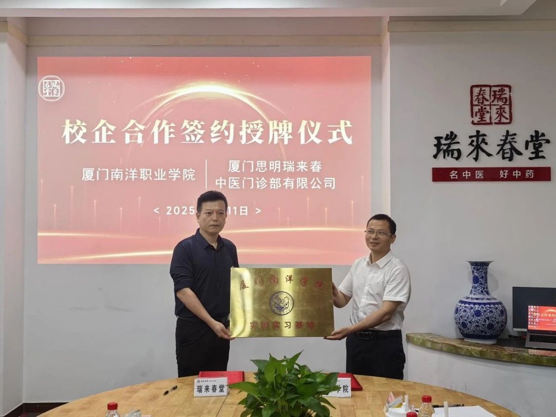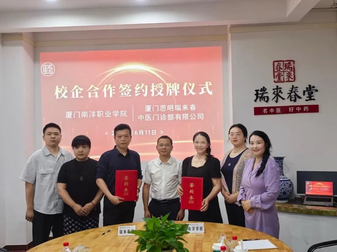在与会人员共同见证下,我校与厦门思明瑞来春中医门诊部有限公司正式签订校企合作协议,并举行实训基地授牌仪式。