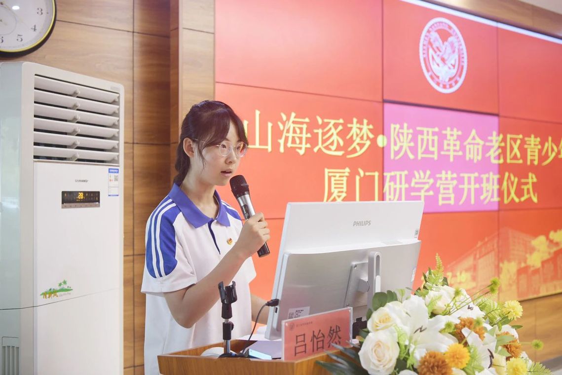 来自延安市黄陵县桥山中学的吕怡然同学作为学生代表发言,表达了诚挚的感激之情,承诺将珍惜学习机会,在行走中思考,在实践中成长,让此次山海之约成为人生中难忘的成长记忆,将来以优异的学习成果回报社会各界的关爱。