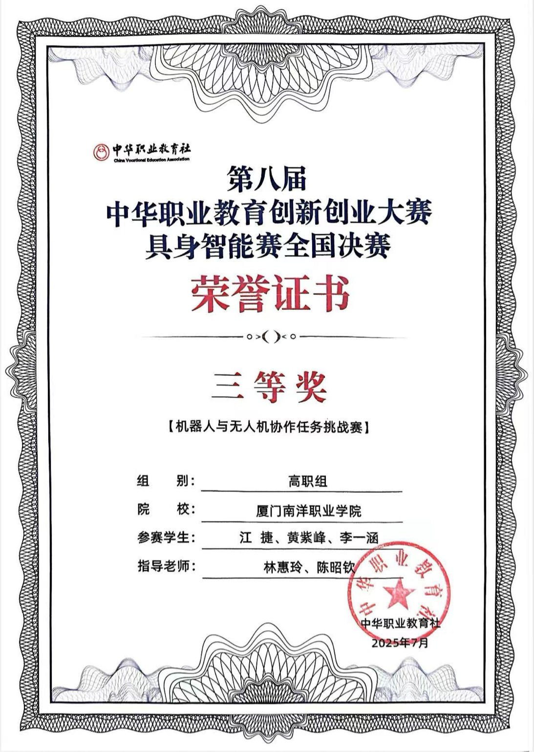 近日,第八届中华职业教育创新创业大赛具身智能赛全国决赛在浙江杭州圆满落幕。我校代表队在“机器人与无人机协作任务挑战赛”中脱颖而出,斩获全国三等奖!
