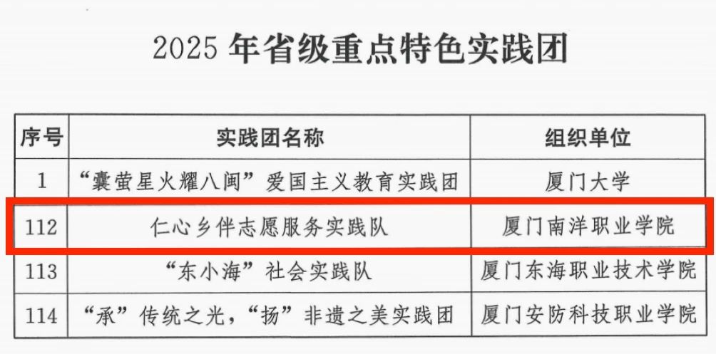 此次实践队入选省级重点特色实践团,是对我校社会实践工作的高度认可,展现出南洋学子以仁心践初心、以专业报家国的精神风貌。我校将持续鼓励更多师生深入基层、服务社会,让青春在为祖国、为人民的奉献中焕发光彩,为实现中华民族伟大复兴的中国梦注入南洋力量!