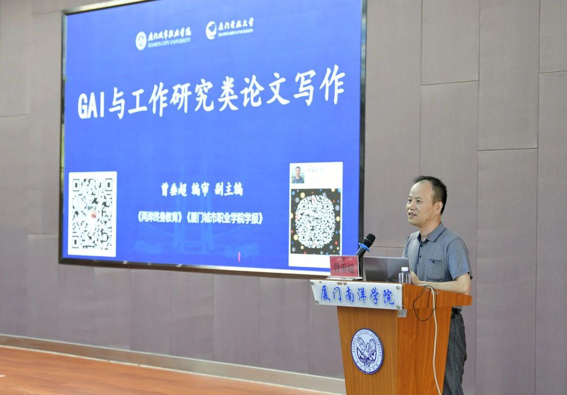 8月28日下午,厦门城市职业学院学报专职副主编曾垂超结合自身丰富的编审经验,带来一场兼具理论深度与实践价值的分享。他聚焦人工智能,围绕“工作研究类论文写作”和“如何提高投稿命中率”两部分展开分享。他提出,“论文的根本,是站在当下对过去及现状进行思考,对未来提出设想。”他鼓励教师们将研究融入日常工作,自觉涵养学术情怀,把论文写在祖国的大地上;自觉学习并提升工作能力,勤写工作日记并储备论文素材,树立正确的问题导向意识,实现在工作中研究、在研究中工作。