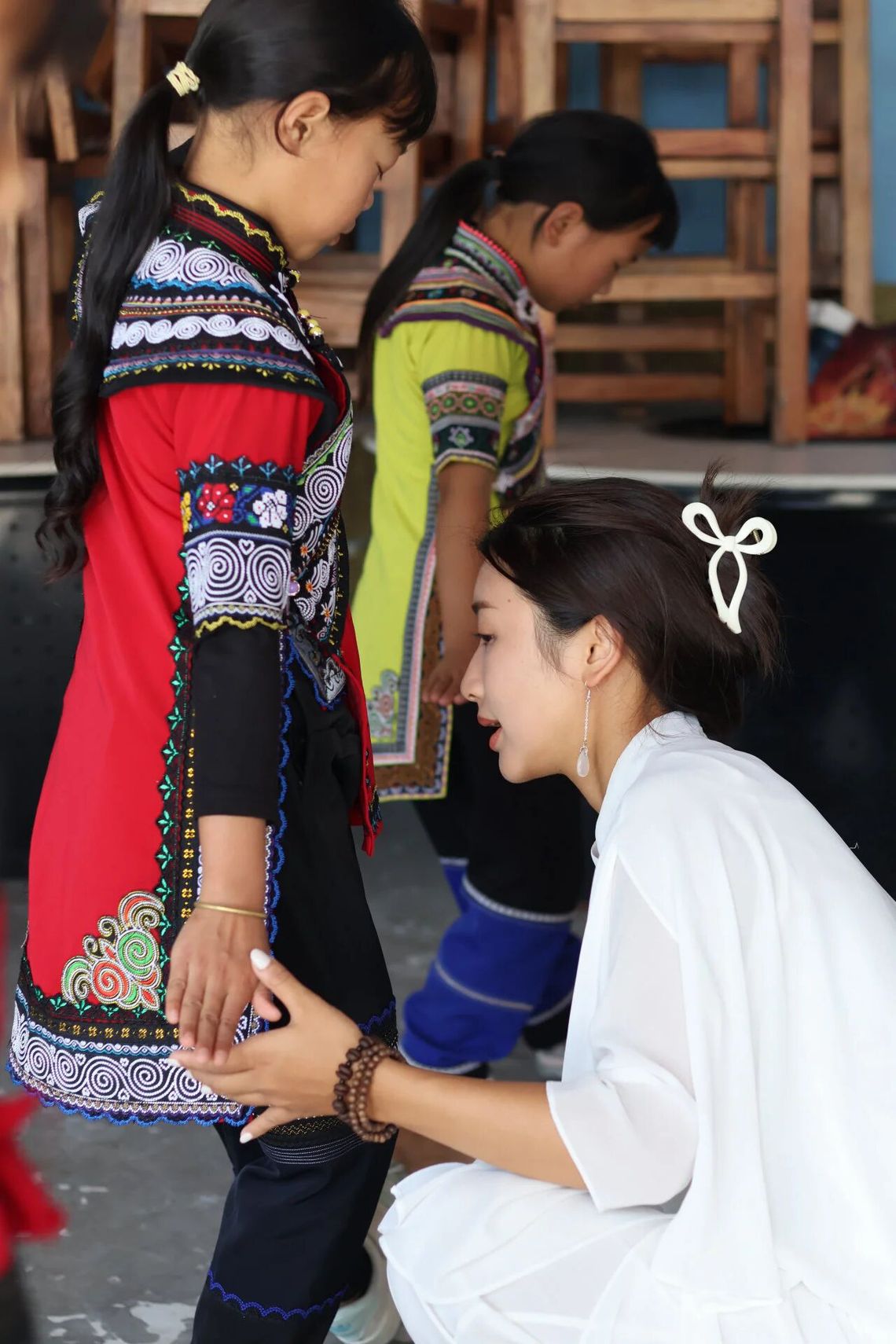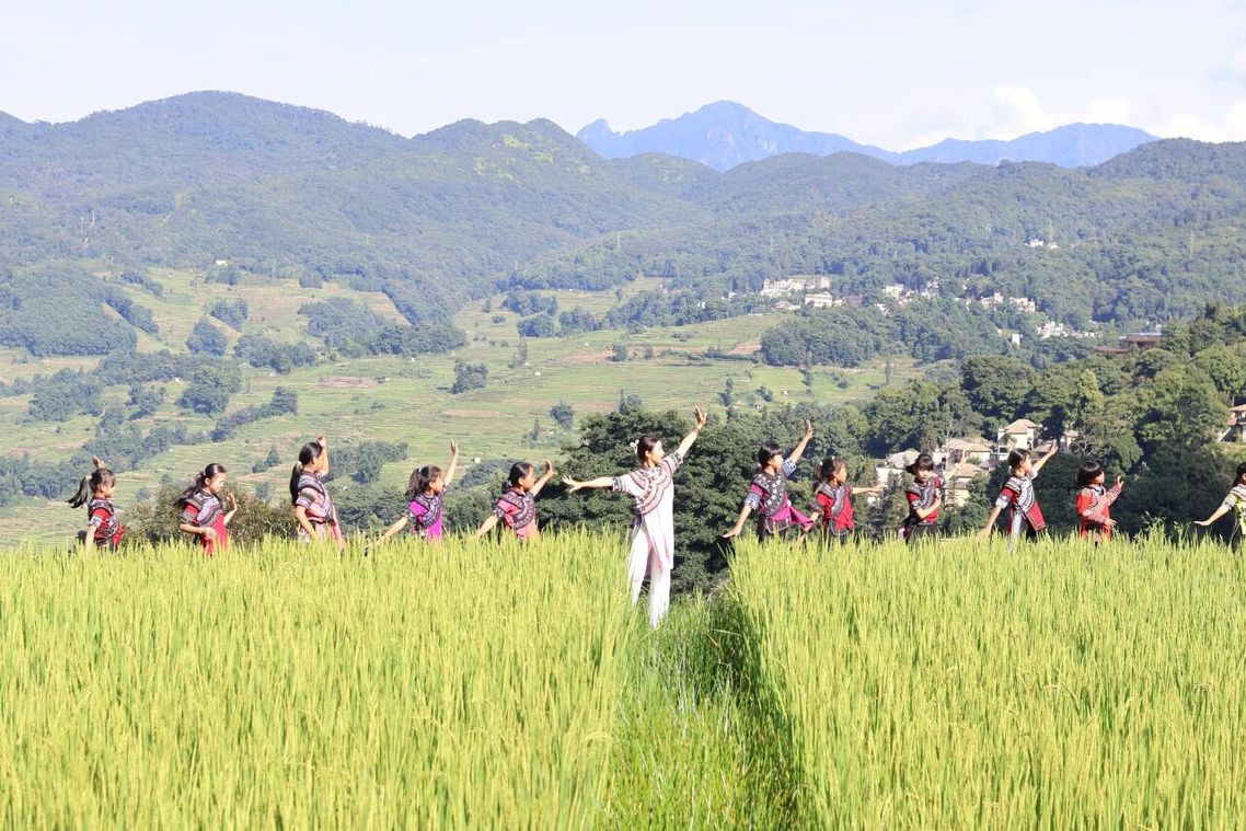 袁颖捷回忆,初次与孩子们见面时,他们有些羞涩,又经不住好奇,上前热情围着她。孩子们没有舞蹈基础,教学环境也是比较艰苦的,没有专业的舞蹈教室、没有把杆、没有镜子。这些都没有难住袁颖捷,没有条件就创造条件。她把餐厅改成临时教室,在千年梯田上教授孩子舞蹈,以天地为舞台,为山海而歌。