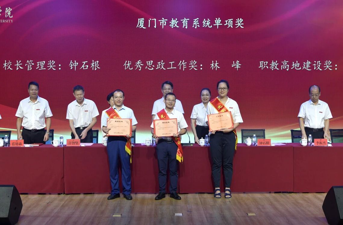 在2025年厦门市教育系统单项奖评选中,我校执行校长钟石根获评“校长管理奖”,马克思主义学院院长林峰获评“优秀思政工作奖”,艺术设计学院教师刘艳艳获评“职教高地建设奖”。三项市级荣誉的斩获,彰显了我校师资队伍在不同领域深耕细作的扎实成果。