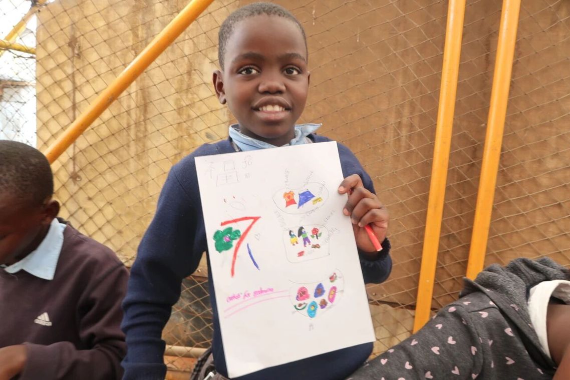 刚到内罗毕时,王今和孩子们用英语和他们沟通,发现他们的英语带有浓重的口音,十四五岁孩子写的句子都是不通顺的。但是想要在这里有好的工作自食其力,甚至走出国门于他们而言英语是必要的。课堂上,孩子们的年纪差距很大,王今便把所有的课堂问题变成绘画的主题,让孩子们用色彩描述他们的内心世界。
