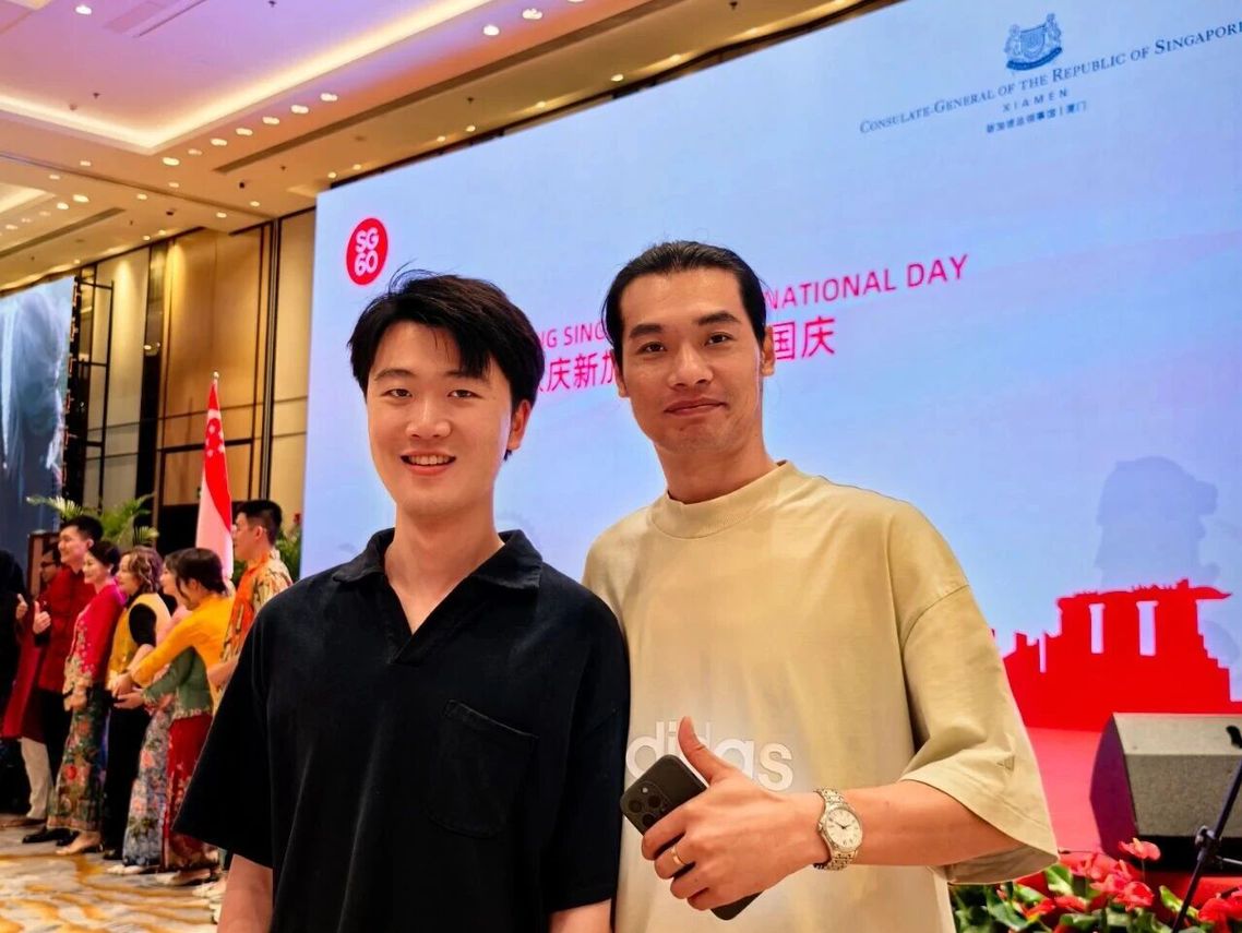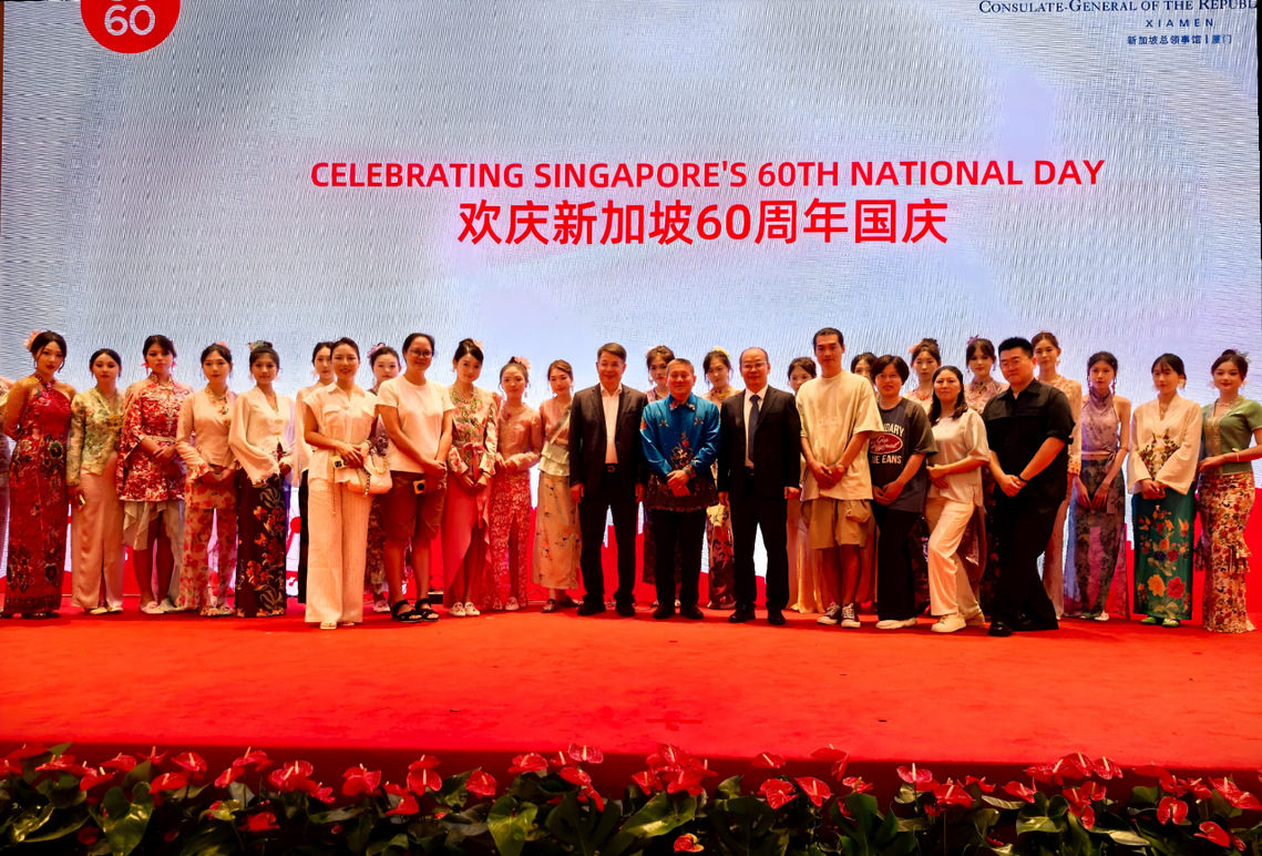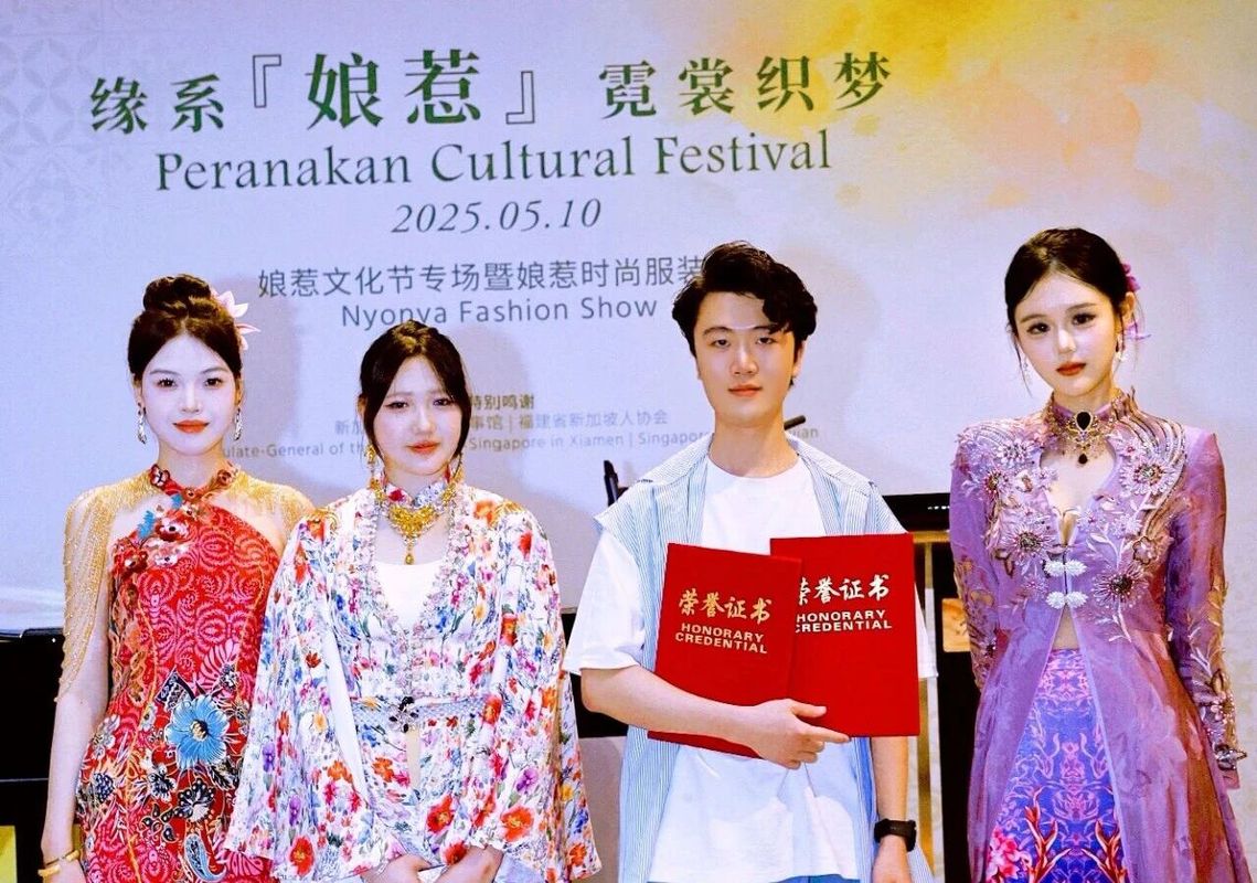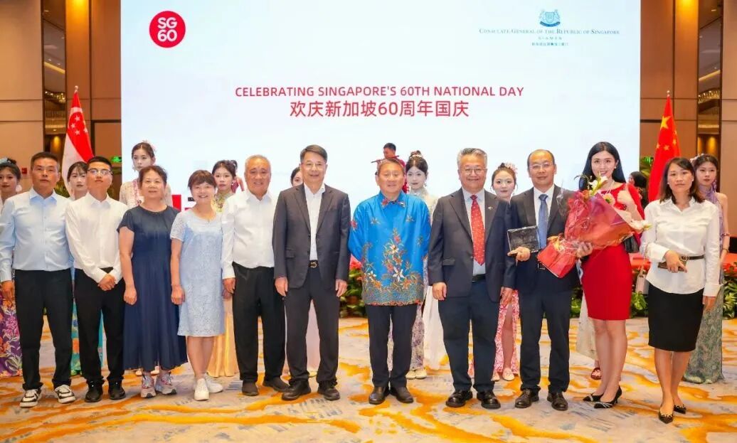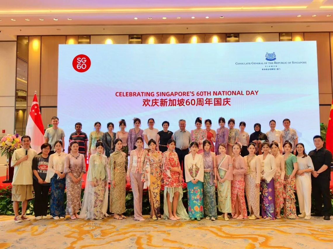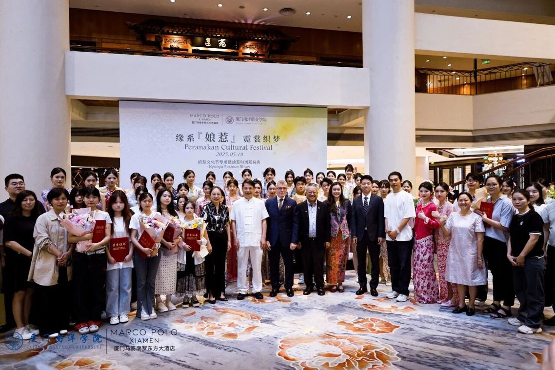 2025年7月,新加坡驻厦门总领事馆在厦门香格里拉酒店举办国庆招待会,郝金龙与学生们设计的娘惹服装压轴亮相,与新加坡著名多元文化乐团yIN Harmony合作带来的娘惹服装展演,以独特的艺术表达向中新友谊传递了诚挚祝福。新加坡驻厦门总领事庄志嘉先生给学校颁发“文化交流贡献奖”奖杯。