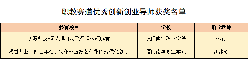 目前,厦门南洋学院依托省无人机协会,通过提供低空经济全产业链规划、农产品电商直播、新媒体运营、一村一品农产品包装设计等多种方式服务全省9个县市,17个乡村,为乡村振兴增添活力,助力学生创业梦想生根发芽。林莉与“漫甘茶业——四百年红茶制作非遗技艺传承的现代化创新”项目指导教师江冰心,二人也凭借本次省赛优异表现获得了省赛“优秀创新创业导师”荣誉称号。