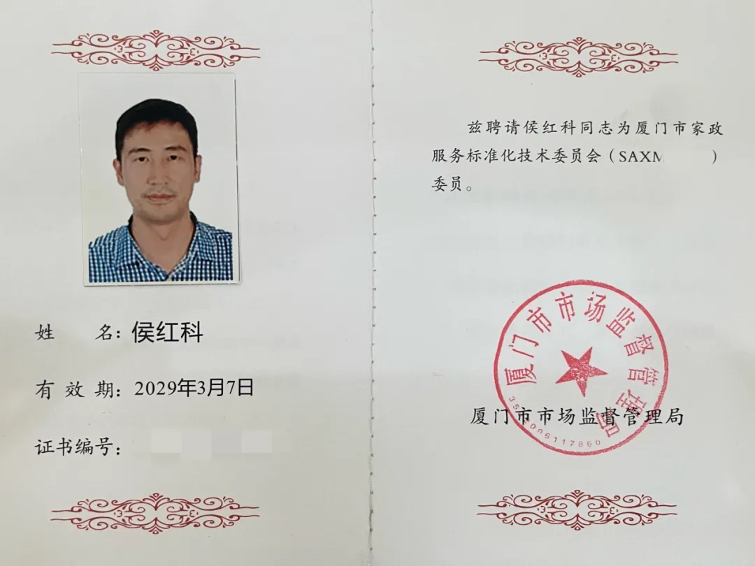 会上,校长助理侯红科与其他三位新增标委会委员共同接受厦门市市场监督管理局颁发的厦门市家政服务标准化技术委员会委员聘书,为家政标委会注入了新动能。
