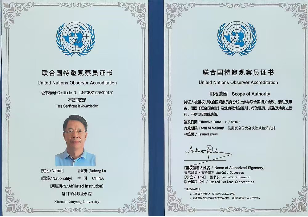 近日,我校创办人、南洋教育投资董事长鲁加升教授获颁联合国特邀观察员证书,被授权以联合国观察员身份参与联合国相关会议、活动。此前,在今年9月22日,鲁加升教授作为国家观察员代表,应邀线上出席第80届联合国大会,聆听李强总理等各国领导人及各界政要的演讲、发言、辩论。