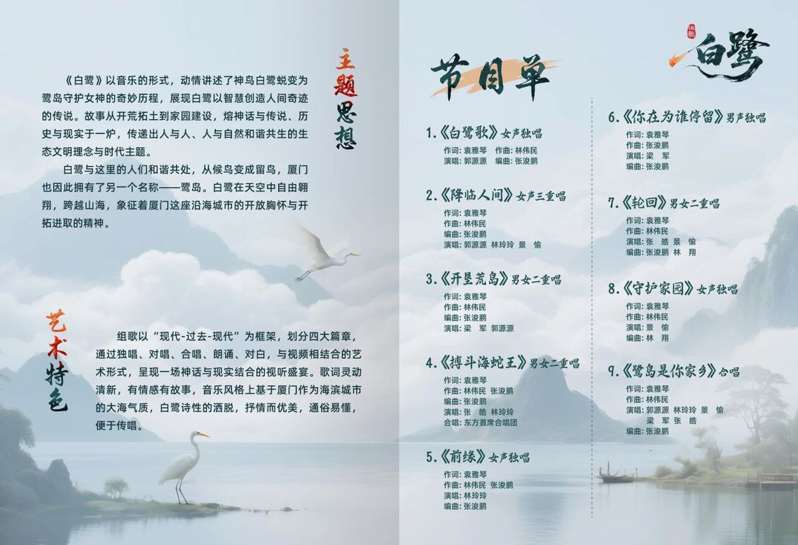 组歌以“现代-过去-现代”为框架,划分四大篇章,将神鸟白鹭蜕变为鹭岛守护女神的奇妙历程娓娓道来。