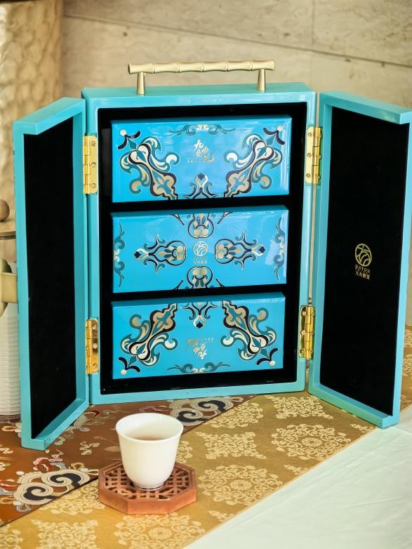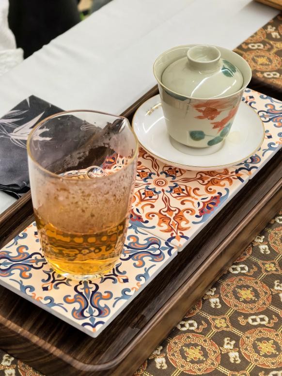 本次奉茶活动紧扣“南洋文化”核心,茶席设计巧妙融入厦门南洋花砖的经典元素——以红、蓝、黄等鲜明色彩勾勒几何纹样,搭配红砖、彩绘瓷等茶具,既彰显了学校扎根闽南、传承文化的办学特色,又还原了南洋风格的美学精髓,为奔波而来的嘉宾与校友送上一份舒心与暖意。