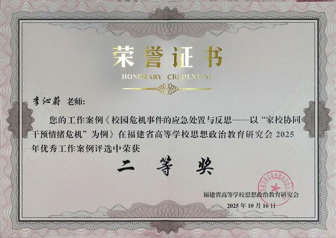近日,福建省高等学校思想政治教育研究会2025年优秀工作案例评选结果揭晓,我校电影学院辅导员李沁蔚工作案例《校园危机事件的应急处置与反思——以“家校协同干预情绪危机”为例》、医学院分团委书记谢婷玉工作案例《从“我”到“我们”:以思政赋能学风建设的“四维共育”实践》分别荣获二等奖、三等奖。