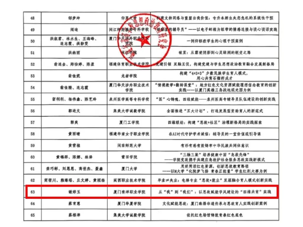 据悉,福建省高等学校思想政治教育研究会于2025年5月启动征集,共收到301篇案例,经专家匿名评审,最终评选出优秀工作案例一等奖20篇,二等奖49篇,三等奖65篇。