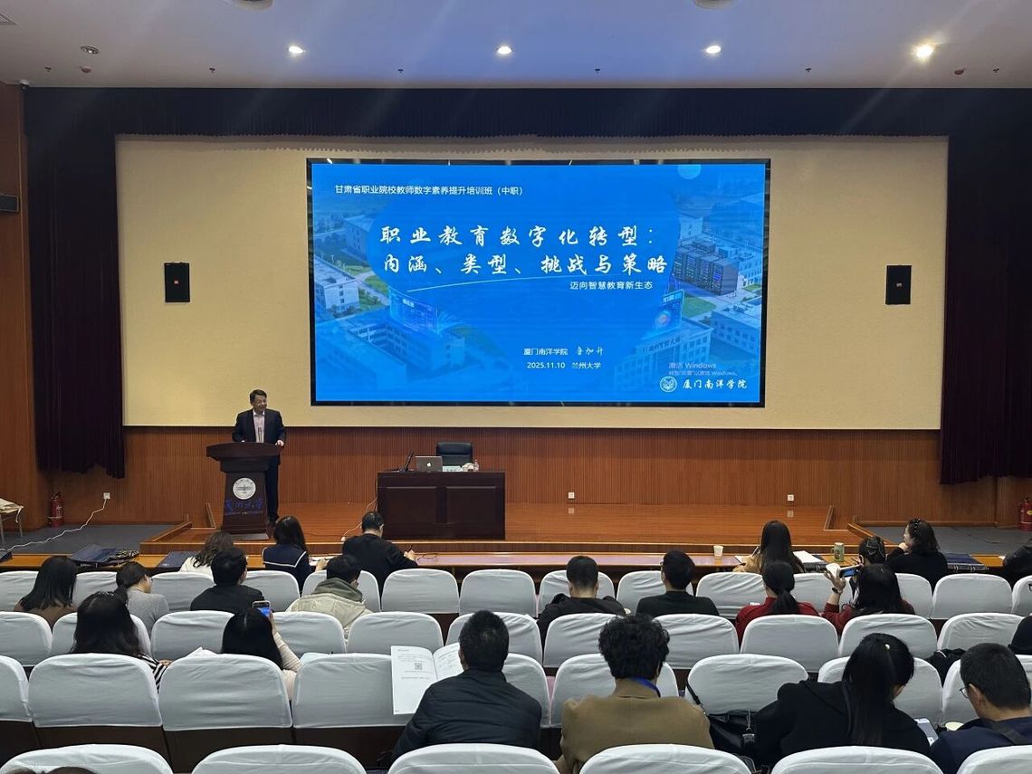 11月9日至11月16日,由甘肃省教育厅主办、兰州大学培训中心承办的“甘肃省职业院校教师数字素养提升培训班(中职一期)”在兰州大学举办,甘肃省全省中职院校专任教师约100人参加培训。11月10日,我校创办人、南洋教育投资董事长鲁加升教授受邀以《职业教育数字化转型:内涵、类型、挑战与策略》为题作专题讲座。11月26日,“甘肃省职业院校教师数字素养提升培训班(中职二期)”即将开班,鲁加升教授也将继续为二期培训班作专题辅导。