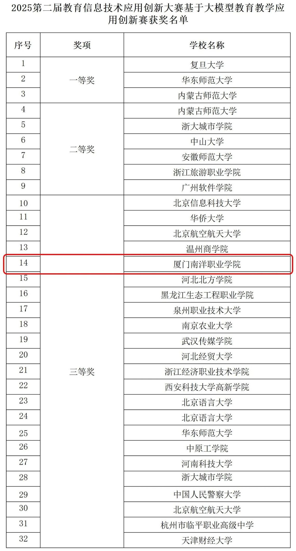 近日,由中国教育技术协会主办,浙江大学与中国教育技术协会网络安全专业委员会联合承办,中国电子工业标准化技术协会信息技术应用创新工作委员会、浙江高校信创联盟支持的2025第二届教育信息技术应用创新大赛公布获奖名单,我校以全国第十四名的成绩荣获三等奖!