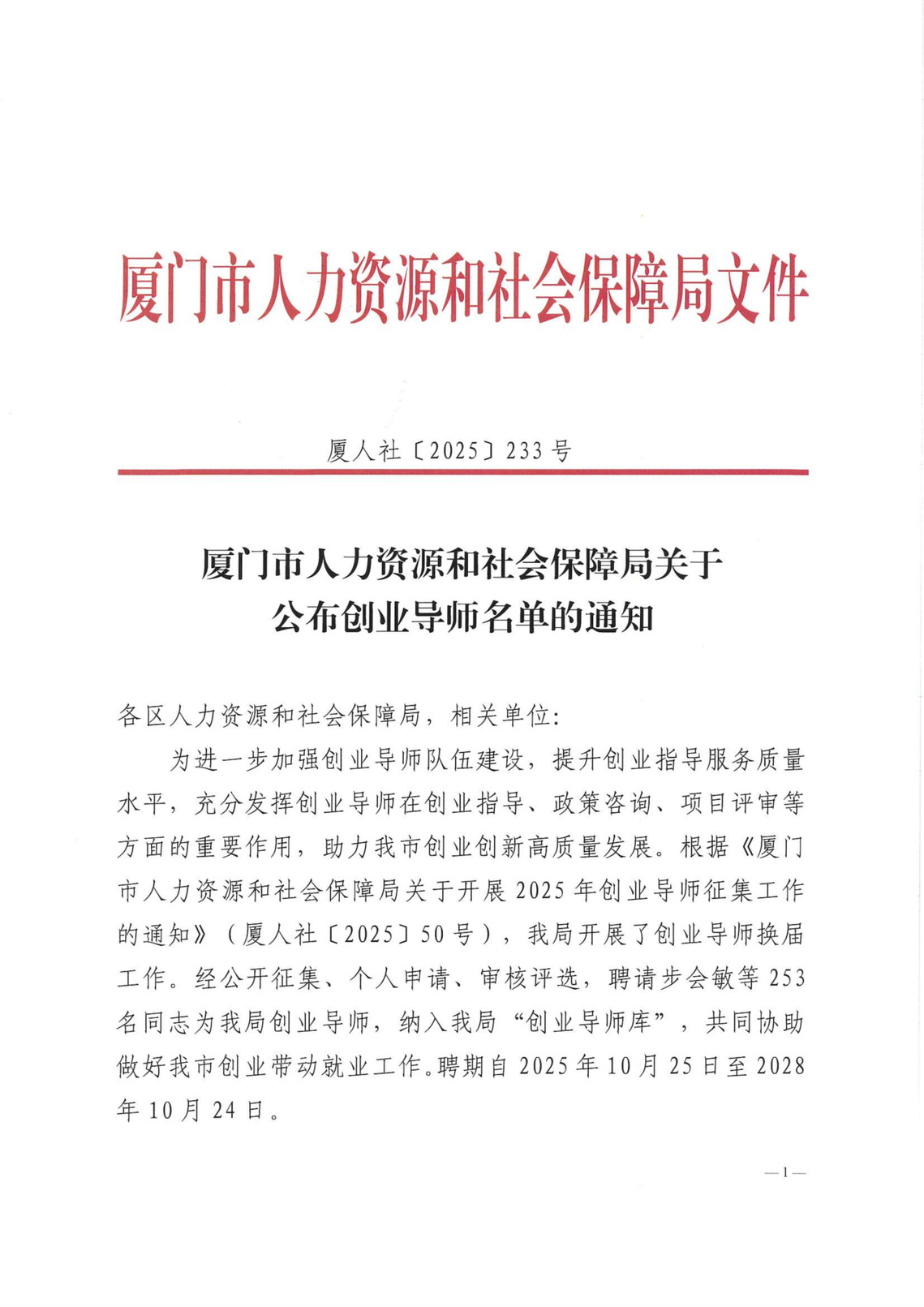 据悉,本次共有253名教师纳入厦门市人力资源和社会保障局的“创业导师库”,聘期自2025年10月25日至2028年10月24日。