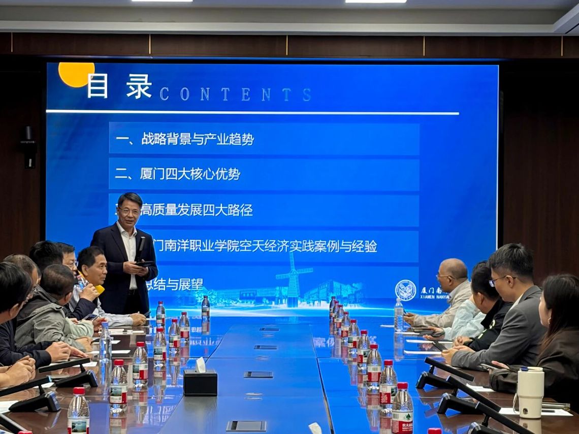 鲁加升教授从“战略背景与产业趋势”“厦门四大核心优势”“高质量发展四大路径”“厦门南洋学院空天经济实践案例与经验”“总结与展望”五个方面展开分析。