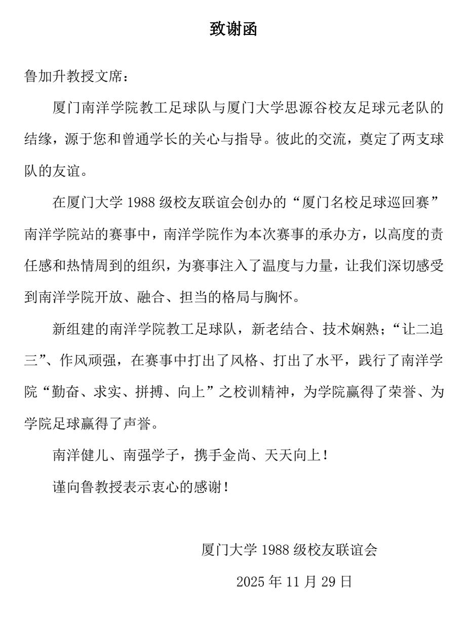 赛后,厦门大学1988级校友联谊会特向鲁加升教授致函表达谢意: