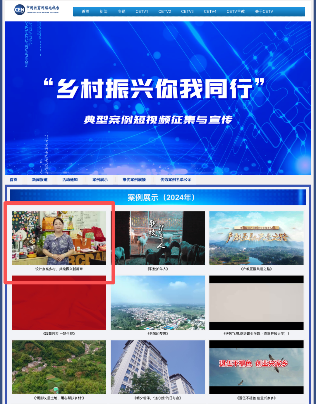 近日,由教育部职业教育与成人教育司主办,中国教育电视台和中国滋根乡村教育与发展促进会承办的第二批“乡村振兴你我同行”典型案例短视频公布入选名单,我校报送的短视频《设计点亮乡村,共绘振兴新篇章》成功入选!