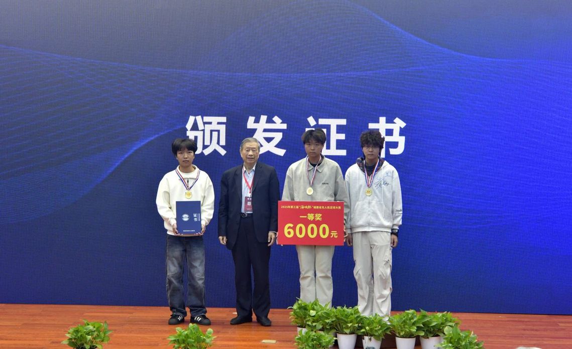 刘大响院士、曲国胜专家、李健军会长分别为福建省无人机足球大赛冠、亚、季军颁发获奖证书。