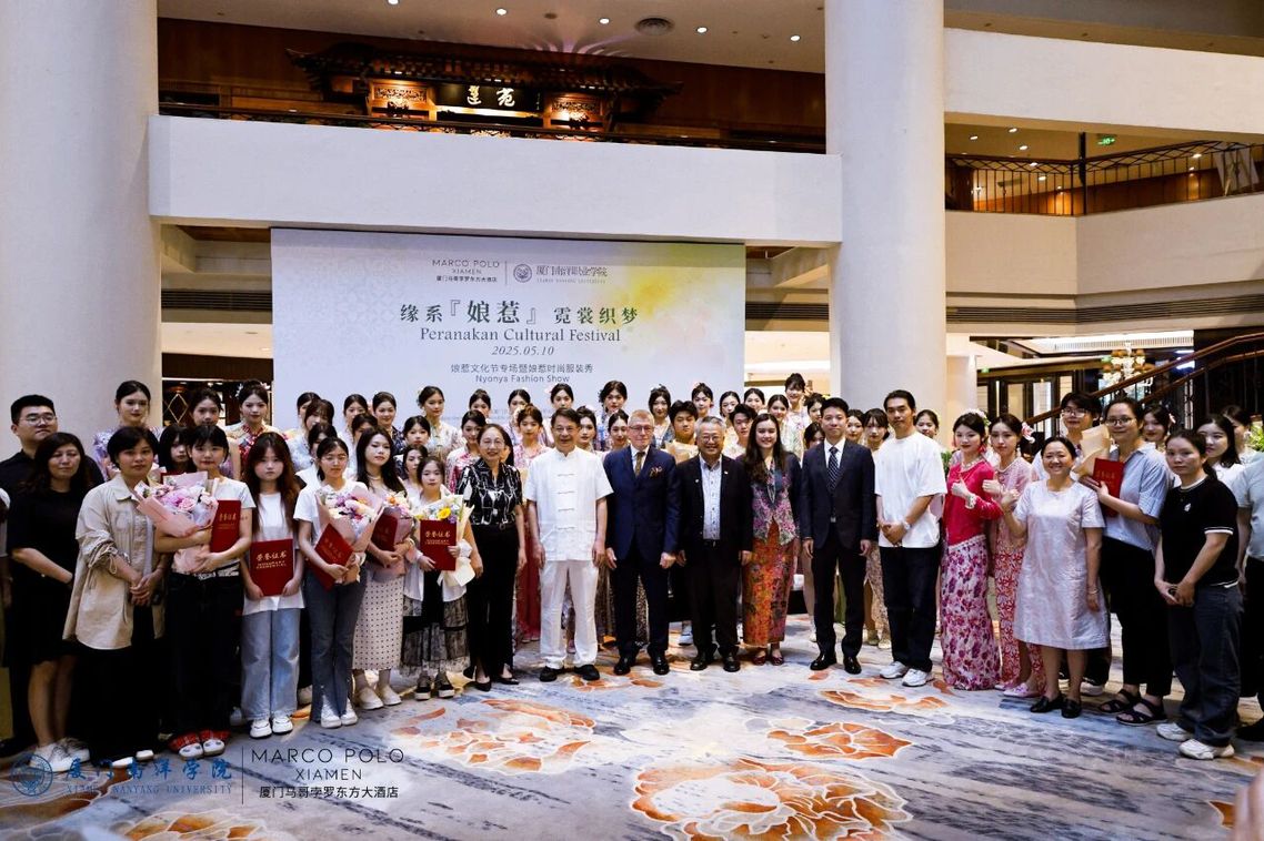 为不断丰富中新及东南亚各国文化交流内容,在新加坡驻厦门领事馆总领事庄志嘉先生和我校创办人、南洋教育投资董事长鲁加升教授的积极推动下,5月10日下午,“2025娘惹文化节之娘惹装卡峇雅(Kebaya)时尚服装秀”惊艳启幕。本次活动由我校主办,马哥孛罗东方大酒店承办,并得到新加坡驻厦门总领事馆、福建省新加坡人协会和厦门市新加坡归侨联谊会的大力支持。来自新加坡、泰国等“南洋”国家驻厦门领事馆的代表、时尚界专家学者、外籍友人及我校师生代表近200人齐聚一堂,见证35套原创娘惹装卡峇雅的璀璨绽放,以衣为媒续写“海上丝绸之路”的文化新篇。